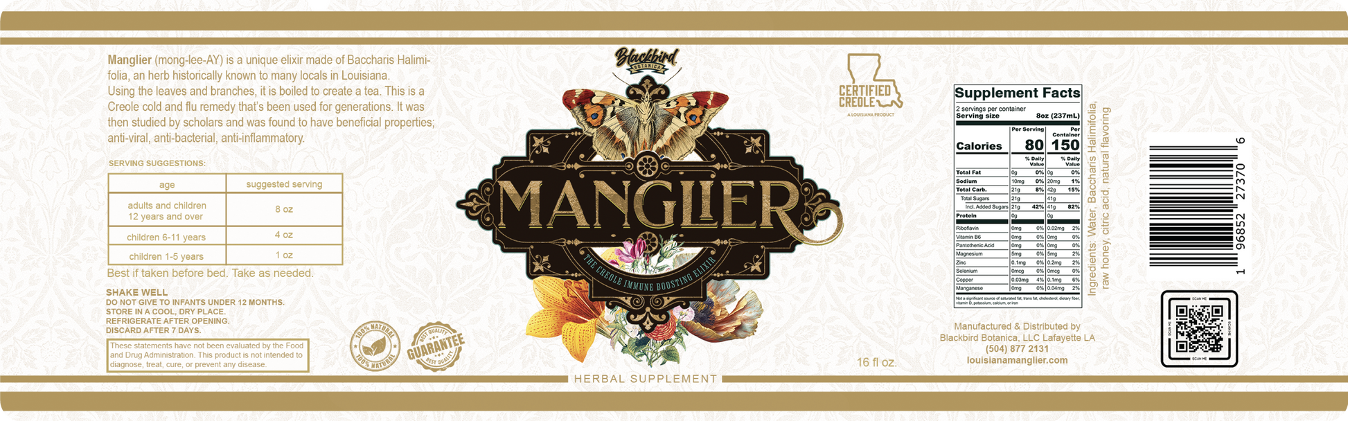 (Caffeine Free) Manglier™ (mong-lee-AY) Tea from Blackbird Botanica is a Creole cold remedy. Passed down for generations, this elixir was used by South Louisiana communities, including Traiteurs, Native Americans and Creoles, for years.
